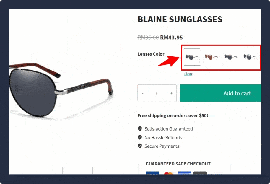 此功能将「产品属性」的「下拉列表」变成漂亮的「色板」。这意味着你可以将这些「产品属性」——例如「不同颜色」衣服的「下拉列表」设置为「颜色色板」,或直接以「图片色板」的形式显示。