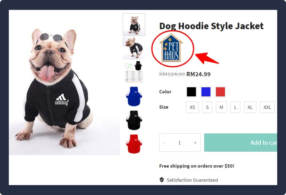 为你的某个产品添加品牌,可以选择在「产品主页」或 「单一产品页面」的某个位置展示你的品牌,如图所示:产品名称(Dog Hoodie Style Jacket)和价格(RM124.99 RM24.99)之间,就是一个品牌。