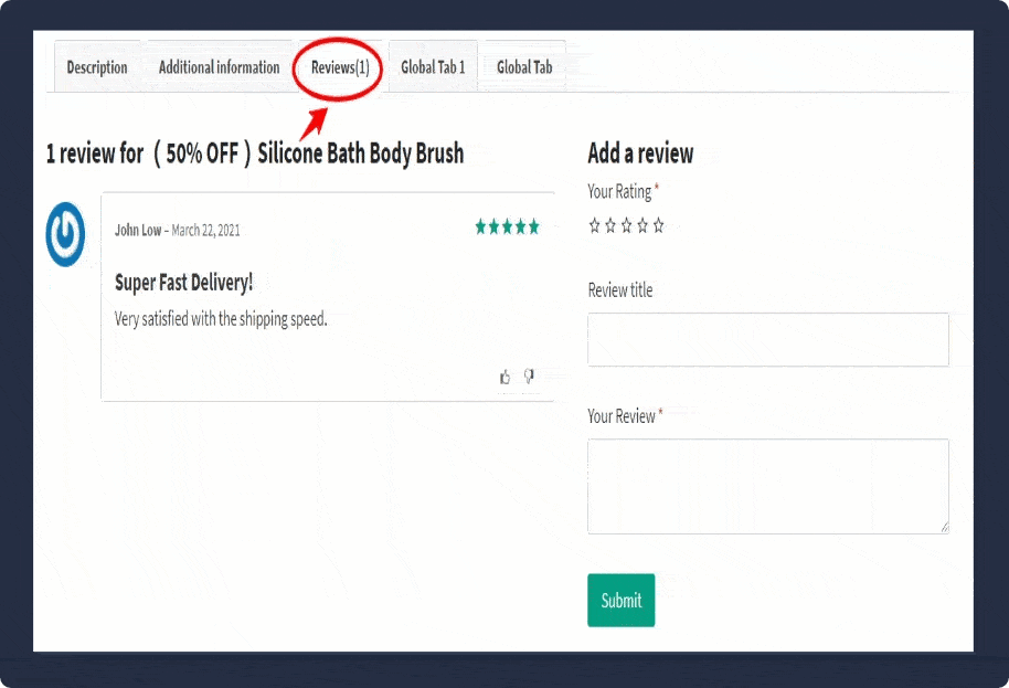 用户可以对他们认为最有帮助(或最没有帮助)的评论进行投票。店主可以设定评论显示的方式,例如:最新的评论或最好的几个评论在最顶端出现。点击「案例演示」后往下拉,一直看到Reviews(1)的标签为止,然后点击进去。