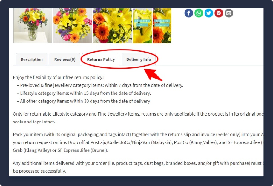 全局标签可以让你添加一个或多个「额外」的产品信息标签,添加后,它会显示在每个单一产品页面上,在默认的「描述」(description) 或 「评论」(reviews) 标签右侧。全局标签非常适合展示重要的「 统一信息 」,例如:提醒顾客下单前必须留意的事情 ,包括退货政策和送货信息。