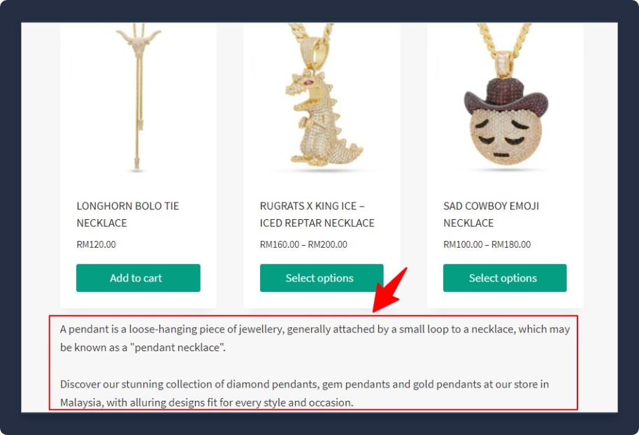 在每个「产品分类」页面的下方,都特地为你提供了一个额外的描述区域,用来描述你的产品分类。你可以为你的产品分类页面提供更多内容和额外的描述,因为这将有助于搜索引擎的优化,并提高页面在搜索引擎的可见度。