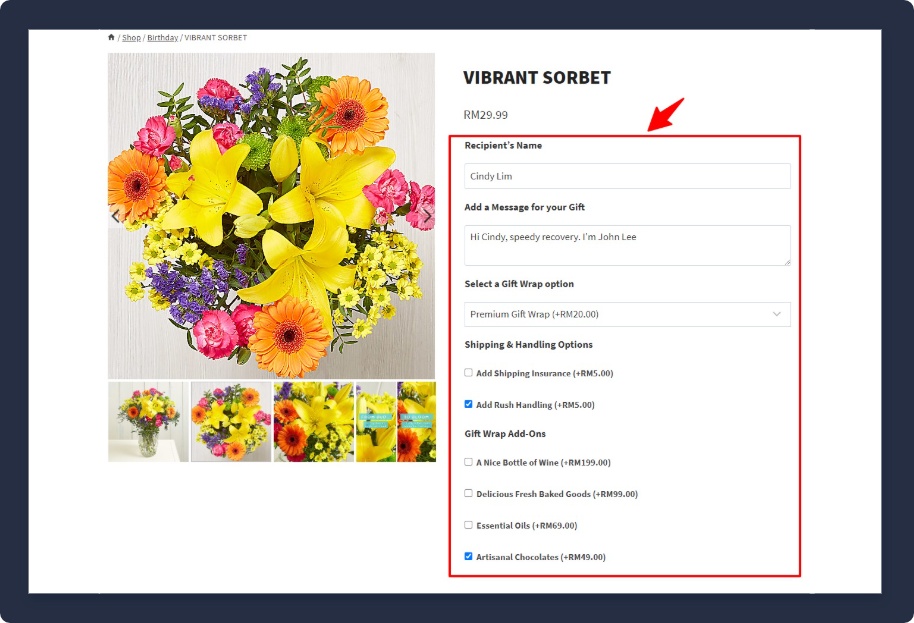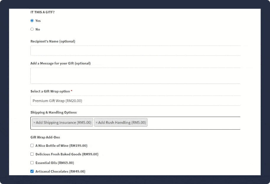 一般的「标准结账页面」只让顾客填写个人资料和地址,但某些生意(例如花店)却需要额外资料。「结账附加功能」允许额外内容的添加,比如收花人、祝福语、花朵包装费用等等。然后系统会将这些额外资料和收费计算进去顾客订单,进而减轻卖家的工作。试A