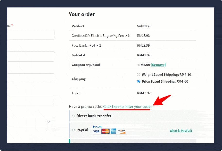 你可以在「结账页面」启用「优惠券结帐模式」。你可以给你的「潜在顾客」或「忠实粉丝」优惠券,那么只要他们在结账页面的指定部分点击链接,就会弹出一个小窗口,以便让他们输入「优惠券代码」,获得特别的折扣。