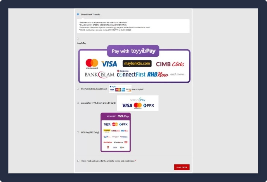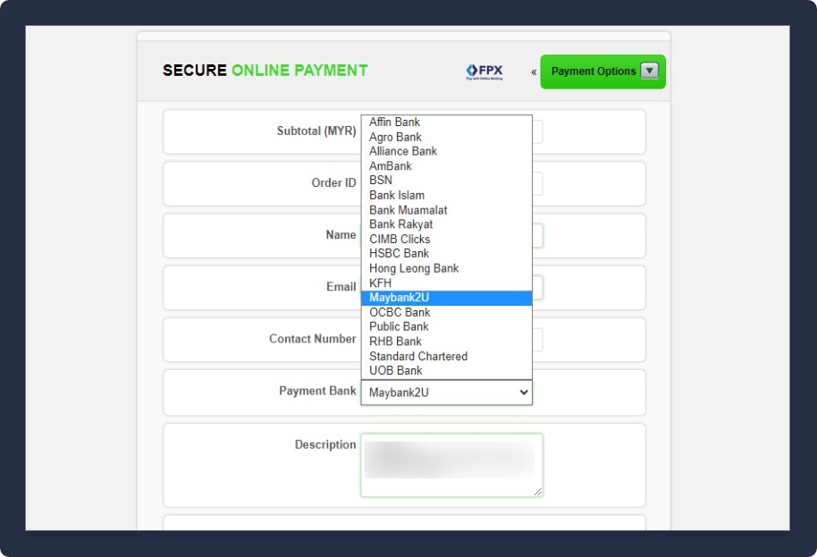 在马来西亚提供FPX服务代理的公司有多家,在您购买我们的网店配套后,我们将会推荐给您2家,即不必缴付「启动费」和「年费」的代理,让您节省营运成本。当然,这些公司也有提供「信用卡」支付,甚至包括现在日趋流行的「电子钱包」转账服务,您可以根据您生意规模的大小进行调整。