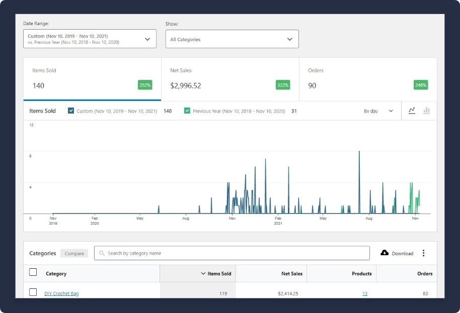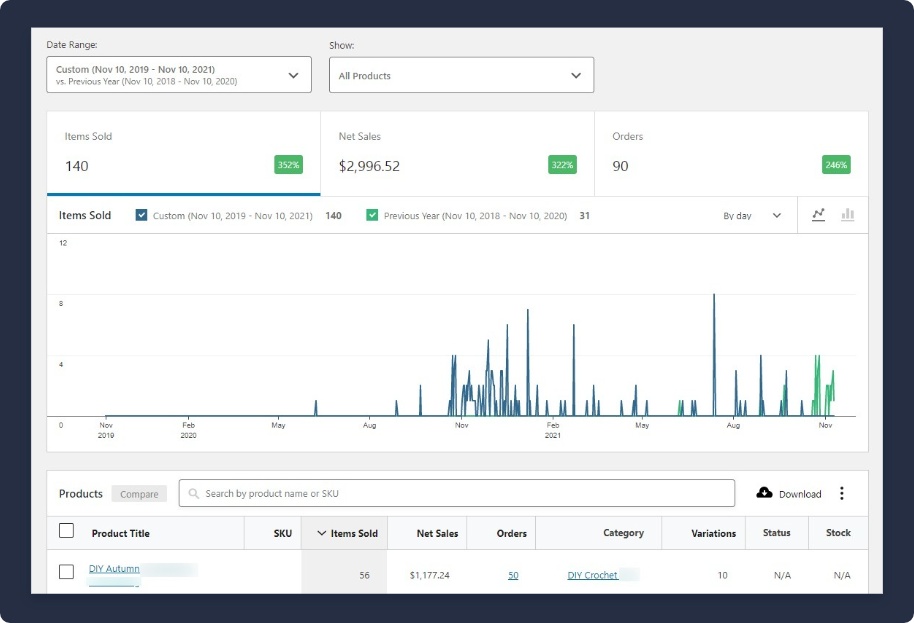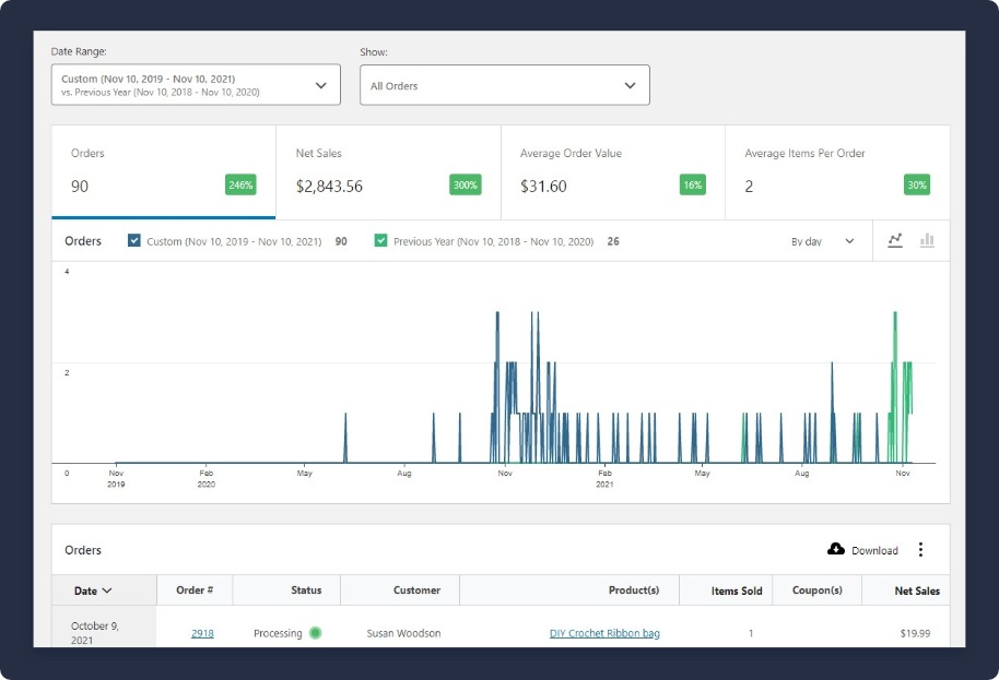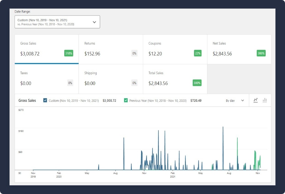 此报告提供特定时间段内销售产品产生的「总收入」的视图,包括「净销售额」(Net Sales)和「总销售额」(Total Sales)。